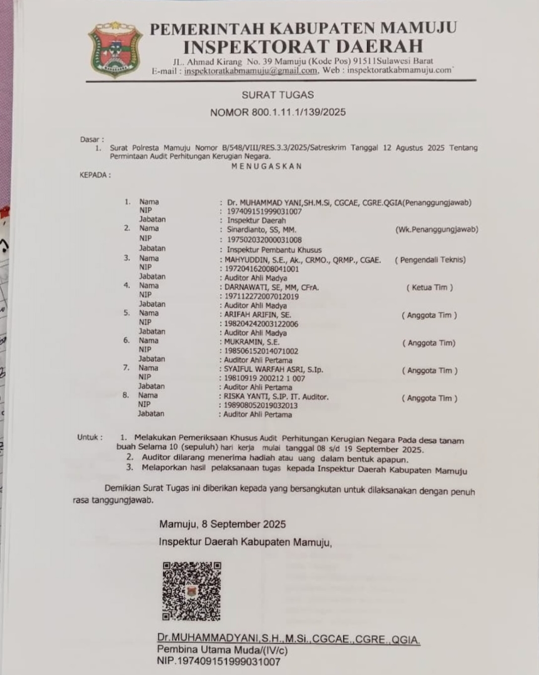 1. Surat Tugas Audit menetapkan jangka waktu pelaksanaan selama 10 (sepuluh) hari kalender dengan Surat Tugas Nomor 800.1.11.1/139/2025 yang dilaksanakan oleh delapan orang tim Inspektorat Kabupaten Mamuju.