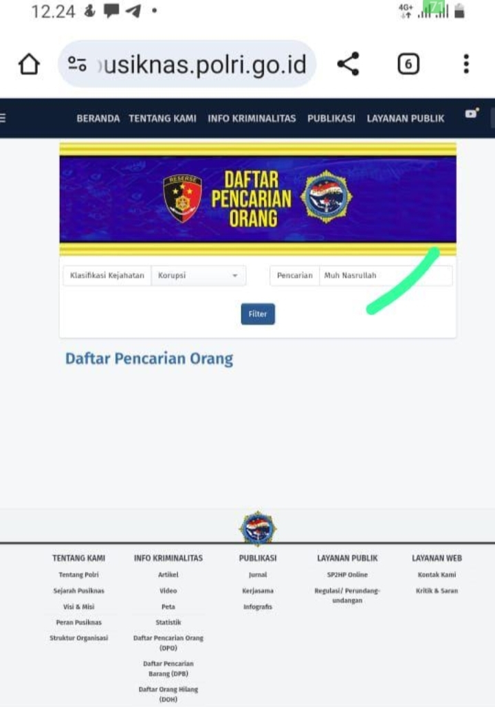 Masyarakat Sulbar, khususnya di wilayah Mamuju, dapat melakukan pengecekan mandiri dengan memasukkan nama “Muh Nasrullah” atau memilih klasifikasi Kejahatan Korupsi pada laman tersebut dan akan mendapati bahwa nama yang bersangkutan tidak terdaftar sebagai DPO resmi Polri.